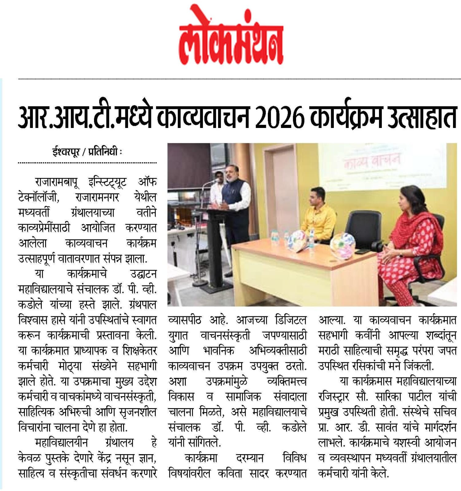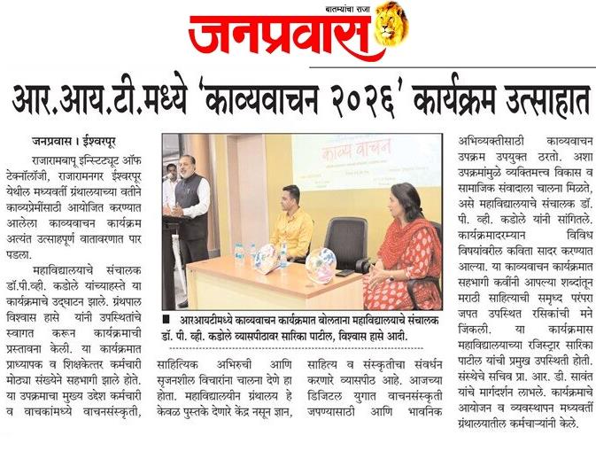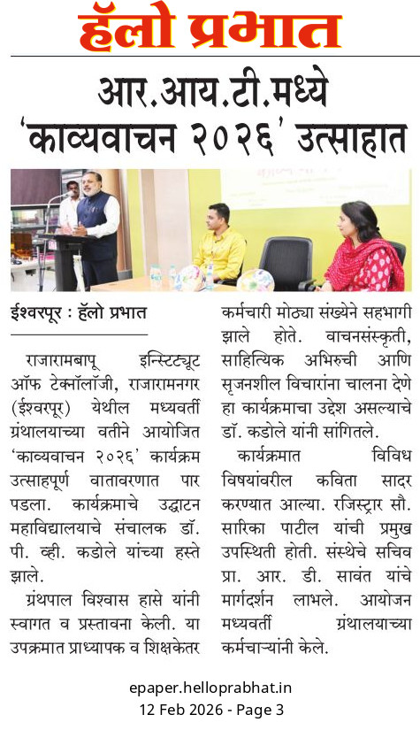 Abstract: आर.आय.टी.मध्ये काव्य वाचन २०२६ कार्यक्रम उत्साहात -लोकमंथन ,जनप्रवास हॅलो प्रभात -पेज नं ०७